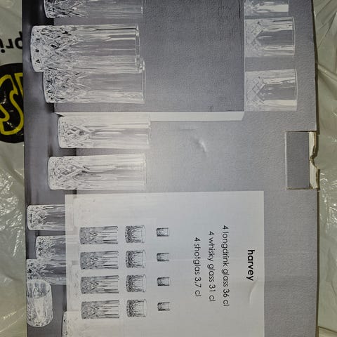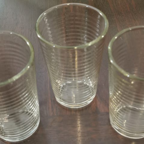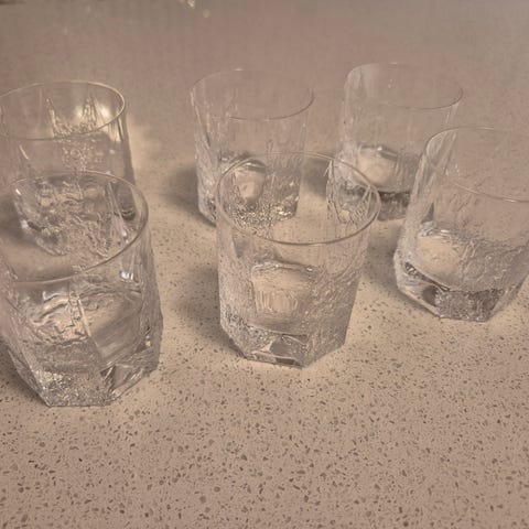 6 glass i nydelig blåfarge, 15 cm høy. Glassene er svært lite brukt og uten skår.