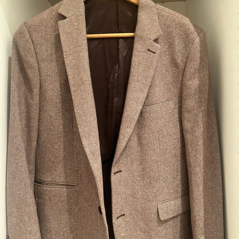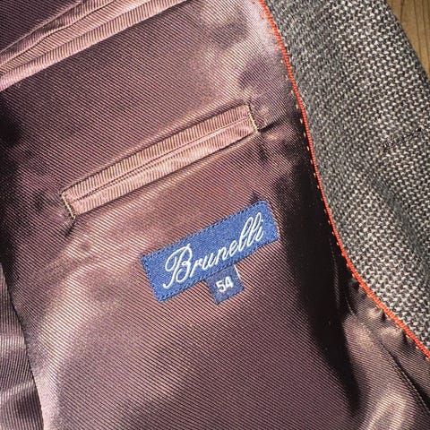 Brunelli blazer i beige farge i størrelse 50. Jakken har detaljer som lomme med mønstret lommetørkle og fôr med flere lommer.