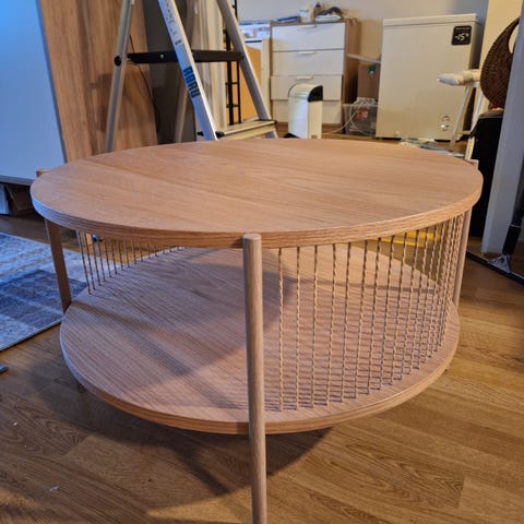 Sofabord i eik med topp i stein-laminat selges. Veldig ripebestandig og tåler mye. Selges da vi skal totalrenovere bolig. Kjøpt på Møbelringen for noen år siden.