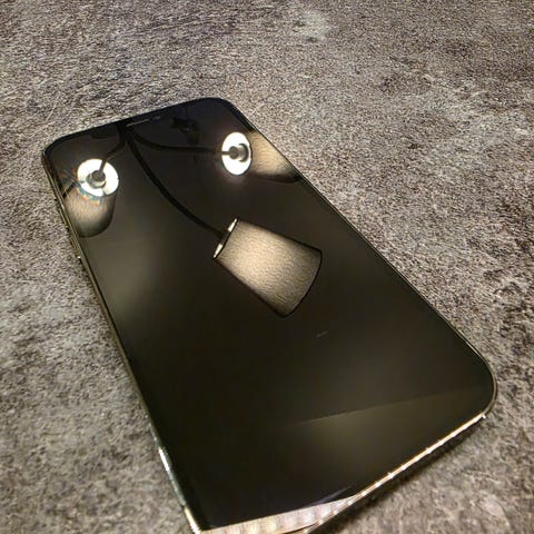 Apple iPhone 12 Pro mobiltelefon med 128 GB lagringskapasitet. Enheten har en svart front og en matt finish på baksiden. Kommer med et gjennomsiktig deksel med magnetisk ring for trådløs lading.
