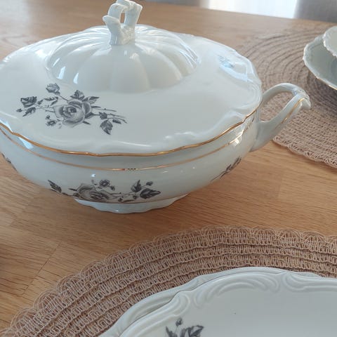 Serviset fremstår i svært pen stand, uten synlige skader (se bilder). To av asjettene har en liten sprekk i kanten (bilde 8).