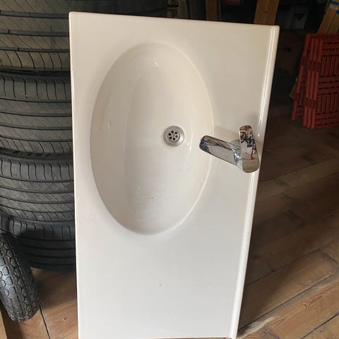 Flott gul / orange vask selges. Skal nedfelles i understell / kommode e.l. Mal til å skjære hull følger med. Noe merker, men ellers fin. Kan sendes. Retro og kul!