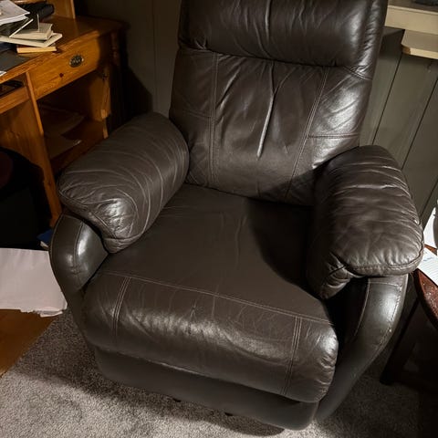 Ekte skinn i hele møbelet. Det er bare den ene stolen som er litt slitt. Ingen hull eller skader, og begge stolene fungerer helt fint. Supergode, bare å plugge i veggen. Bordet i midten trenger et malingsstrøk. Kjøpt på Møbelringen for 20.000,-.