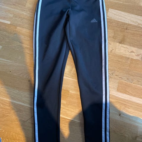 Adidas løpetights for dame i størrelse S. Tightsen er svart med hvite striper langs sidene. Laget med Aeroready-teknologi for fukttransport. Passer til løping og annen fysisk aktivitet. Tightsen er i veldig god stand men har fått en liten slitasje på et kne. Denne lille slitasjen gjenspeiler ikke tilstanden ellers. Se bilde.