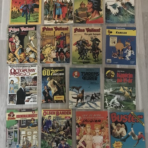 20 krigs tegneserier fra ulike serier selges samlet kr 300,-