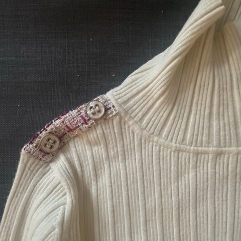 Jacadi genser i størrelse 140 for jente. Genseren er laget av merinoull og har en rød farge. Den har lange ermer og knappelukking bak kragen.