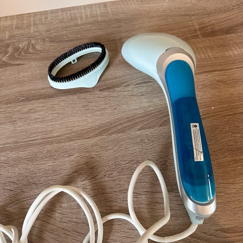 Philips håndholdt klesdamper i blå og hvit farge. En elektrisk enhet designet for å fjerne rynker fra klær ved hjelp av damp. Utstyrt med ledning og støpsel for tilkobling til strøm.