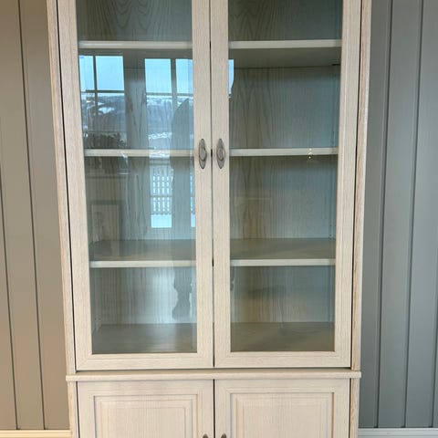 Vitrineskap og salongbord i tre med glassplater. Vitrineskapet har to dører og glasshyller, egnet for oppbevaring og visning av gjenstander. Salongbordet har en glassplate og en underhylle i tre, passende for stuebruk.