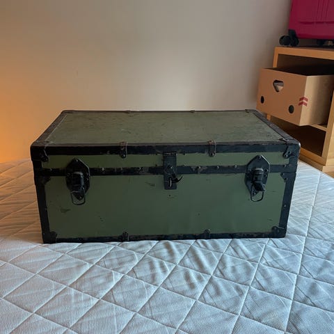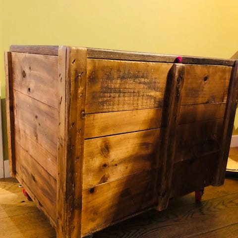 Gammel vedkasse som opprinnelig er ei fiskekasse. Kan taes med til byen