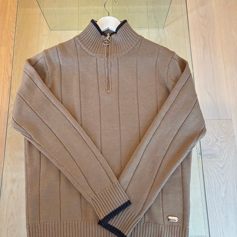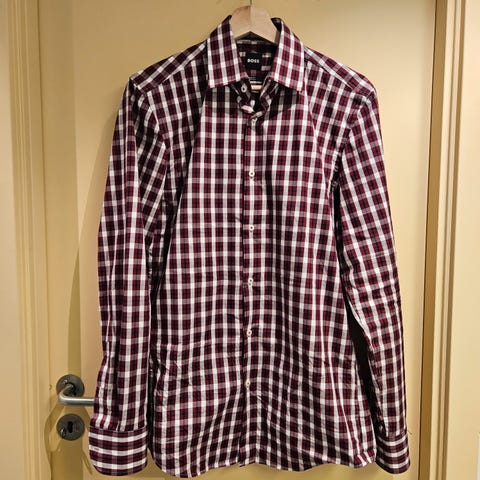 Selger en flott skjorte fra Boss i str 48. Den har dobbel mansjett se bilde. Noe gulnet i hals. Hadde tenkt å klore den hvit men den var for stor.