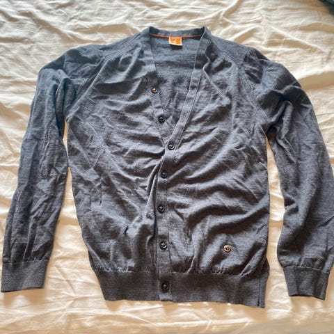 H&M svart cardigan i bomull for herre, størrelse L. Cardiganen har knappelukking og er laget i ull og bomullsmateriale.