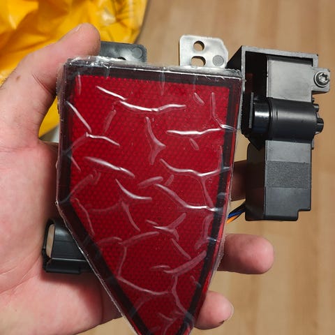 Tesla M3/Y Fascia Lamp høyre side. Reservedel til Tesla Model 3 og Model Y. Lampen er produsert i plast og glass, og er beregnet for høyre side av frontfasaden på kjøretøyet. Produktet er originalt og har etikett med produksjonsdato 07.21.2021.