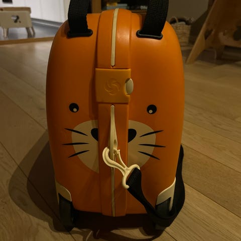Selger Samsonite barnekoffert å sitte på i tigerdesign. Kofferten har fire hjul og drastropp, og passer som håndbagasje.