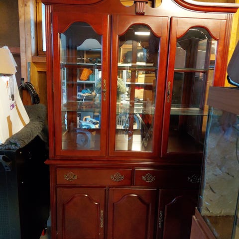 Antikk vitrineskap laget i tre med doble glassdører og flere hyller for oppbevaring og visning av gjenstander. Møbelet har et klassisk design med dekorative detaljer og flere skuffer og skap under for ekstra lagringsplass. Må hentes.
