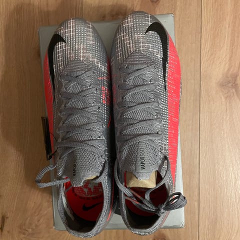 Nike fotballsko i forskjellige modeller og farger, inkludert svart med rødt, hvit, svart med rosa, grå med oransje og grå med gult. Skoene har snøring og er designet for bruk på fotballbanen. Str 40,5-43, kan sendes