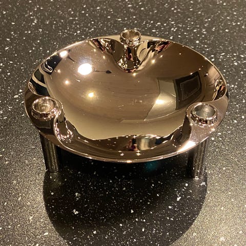 Hadeland Glassverk dekorasjonsfat i glass med dekorative hvite mønstre på gul bunn. Fatet er designet for dekorasjon og kan brukes som et dekorativt element i hjemmet.