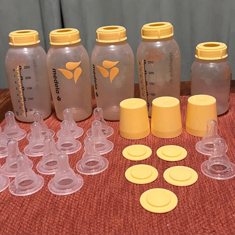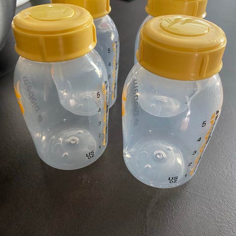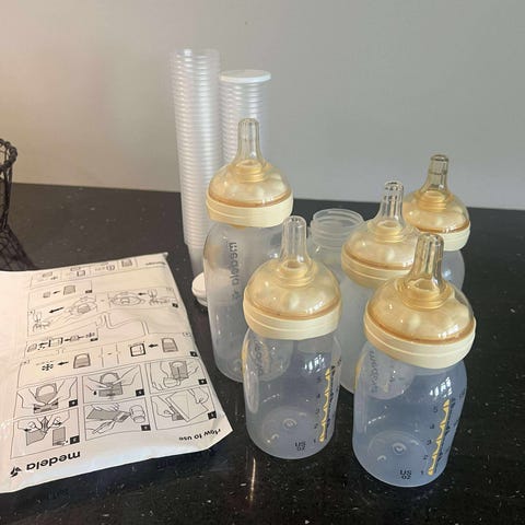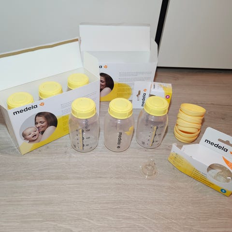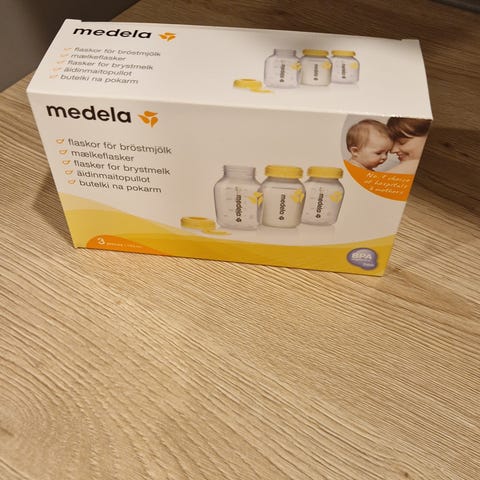 Selger medelaflasker. De minste er godt brukt men mye bruk igjen. De to største er kjøpt i år. Det følger med 8 smokker i strl S og 4 smokker i størrelse M.
