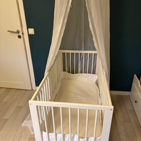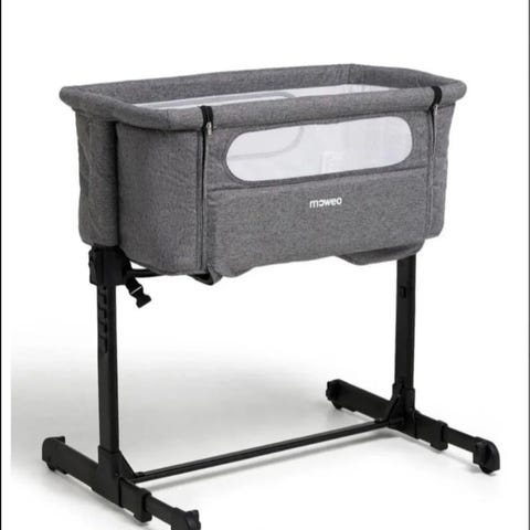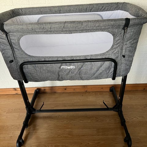 Moweo Bedside crib barneseng. Barneseng designet for å plasseres ved siden av foreldreseng, med sidevinduer for lufting og oversikt. Laget i grått stoff med solid ramme og justerbare ben for stabilitet.