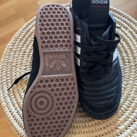 Adidas Mundial Team fotballsko str 42 selges rimelig grunnet slitasje i sålen ved hælen, se bilder. Ellers i meget god stand. Les mer om denne type fotballsko her:
