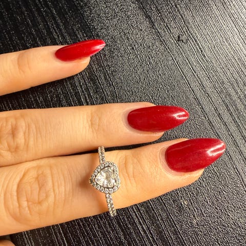 Ringen har et hjerteformet design med rødt steininnlegg. Størrelse 54.