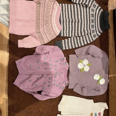 Tre godt brukte ullplagg som er for små nå. Str 104. (Noen 110-116 men syns det er mer 104-110).