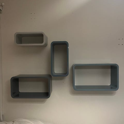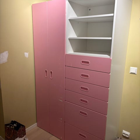 IKEA barnemøbler oppbevaringsenhet med flere nivåer og rosa plastskuffer. Vegghylle, stol og lav pult