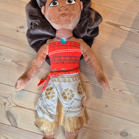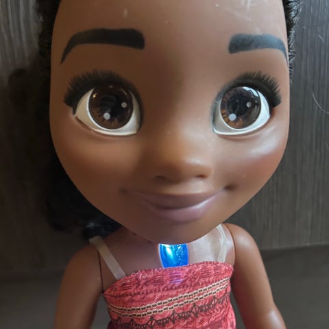 Disney Vaiana dukke med tilbehør inkludert årer, tradisjonelle klær og hodepynt. Dukken har detaljerte klær i rødt, hvitt og beige med blonder og mønstre. Passer som samlerobjekt eller lek. Hun kan også synge hvis du trykker i hånden hennes.
