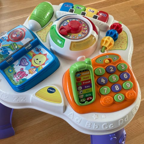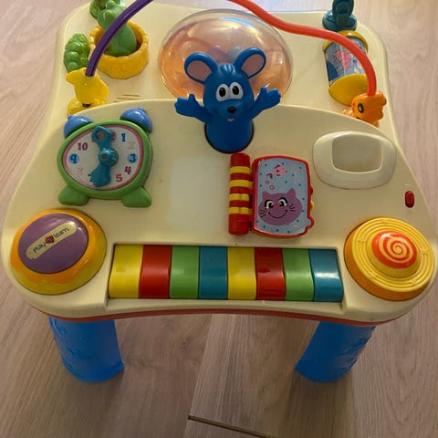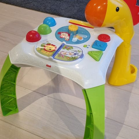 Fisher-Price aktivitetsbord med flere funksjoner inkludert fargerike knapper, gåvogn, trommer, og perlelabyrint. Inkluderer også en fjernkontroll-leke og andre små aktivitetsleker som stimulerer barnets motorikk og sanser. Passer for små barn og bidrar til tidlig læring og utvikling.