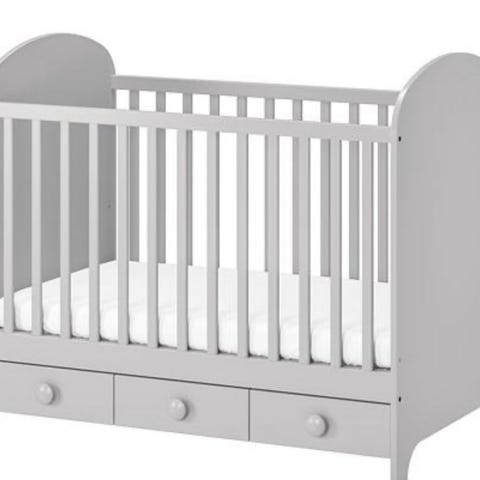 Høy barnestol i grå farge. Justerbar høyde på sete og fotstøtte. Laget av tre. Stolen er veldig fin og lite brukt (har bare stått hos besteforeldre). Bare brukt av ett barn.