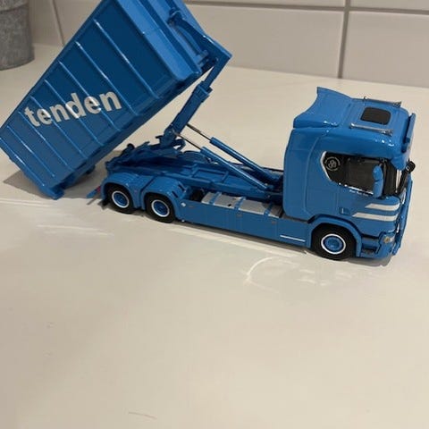 Utrolig detaljert og flott sak. Kjøpt ny og oppbevart i esken. Lastearmer og skuffe må holdes oppe manuelt, da de siger sakte tilbake av seg selv.