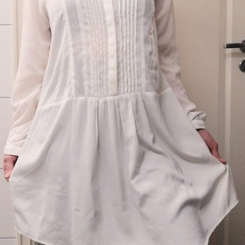 Blankt Cava skjørt av viskose fra Mango. Skal ligne på omslagsskjørt, men har glidelås. Grå-sølv-beige i fargen. Tung og fin i tekstilen. Flatterende og elegant i formen. Se bilder hvor noen få tråder har "løsnet", men disse er etter min mening lite synlige. Lappen er klipt av, men mener at den er av 100% viskose.