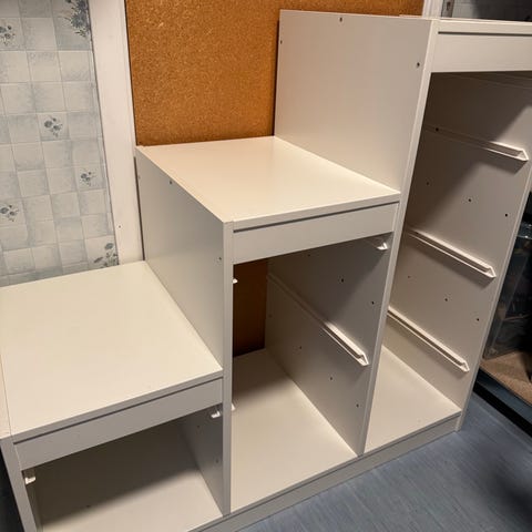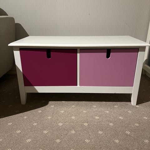 Selger en pent brukt IKEA Trofast trapp med oppbevaring i hvit med 2stk hvite skuffer. Trappen har flere trinn og integrerte oppbevaringsrom som kan brukes til organisering av småting. Passer for barn og kan brukes i barnerom eller lekeområde.