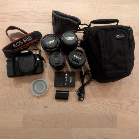 Selger et Canon EOS 5D Mark II med Canon EF 24–105mm f/4 L IS USM objektiv, ekstern Canon-blits og kameraveske.