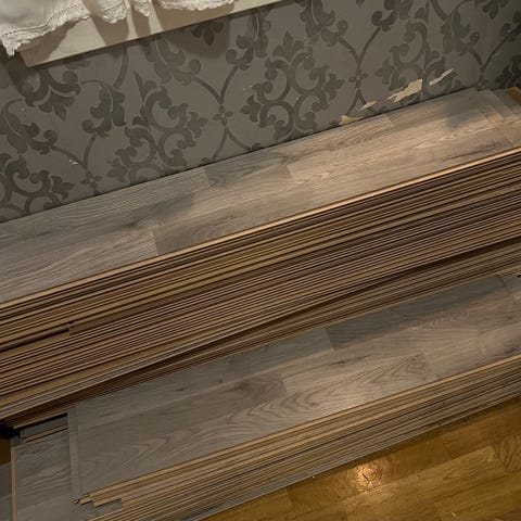 Pergo Klik laminatgulv i 2-pakning. Laminatgulvet har en naturlig trefinish og kommer i pakker som inneholder flere paneler for enkel installasjon. Noen plater utenom også