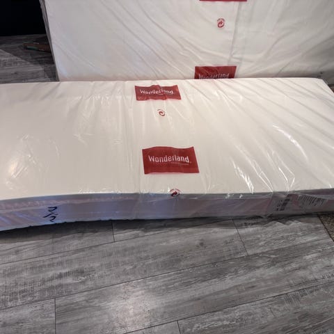 Madrassen er fast og svært godt å ligge på, lyset i rommet overdriver bruksmerkene på madrassen.