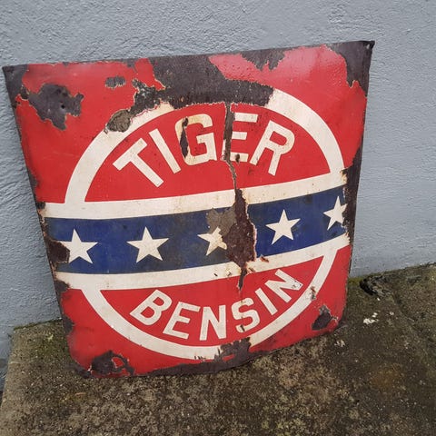 Tiger bensin i blikk fra 90tallet, striper rust og patina.