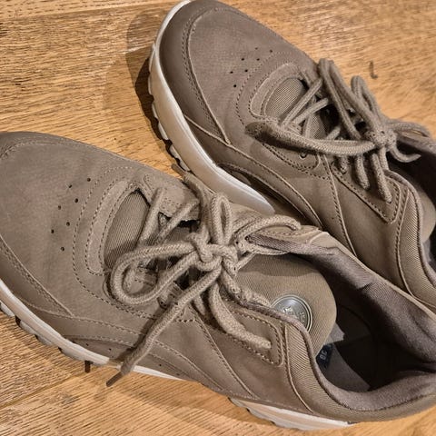 Svart semsket skinn og beige såle. Egnet for daglig bruk.