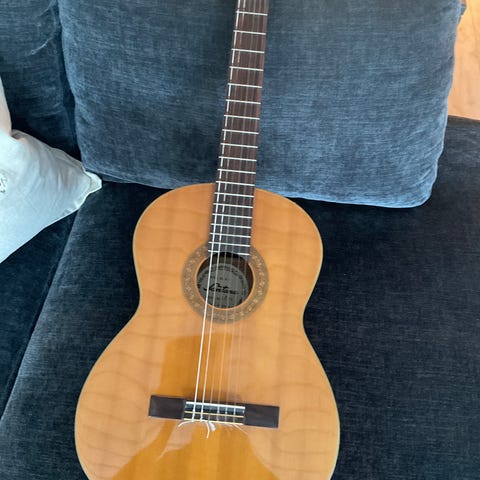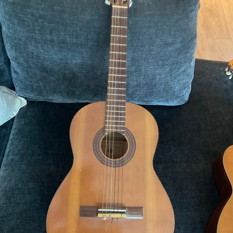 Akustisk gitar i str 3/4 som passer til unge nybegynnere. Tuner, ekstra stringer og eske følger med. Brukt av 1 barn. Som ny 😊