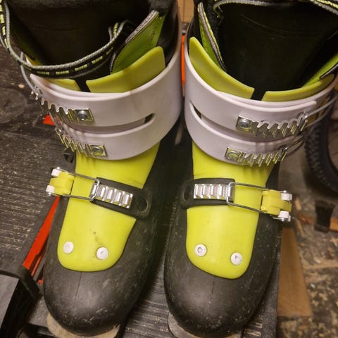 Vi selger slalåmstøvler gule støvler(Rossignol) str 23-23,5 og 273 mm utvendig, hvite støvler(rossignol) 275 mm 23,5 cm gull farget støvler (rossignol) 267 mm 22,5 cm svarte støvler små (nordica) 250 mm 21 cm. Svarte støvler store (Salomon) 288 mm 24/24,5