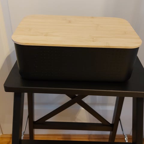 Snasen gul Bodum Brødboks med trelokk som også fungerer som skjærefjøl. Med luftehull for lagring av brød og slikt. Selges samlet med et dekorativt serveringsbrett fra IKEA og en vekt til 150kr 👍