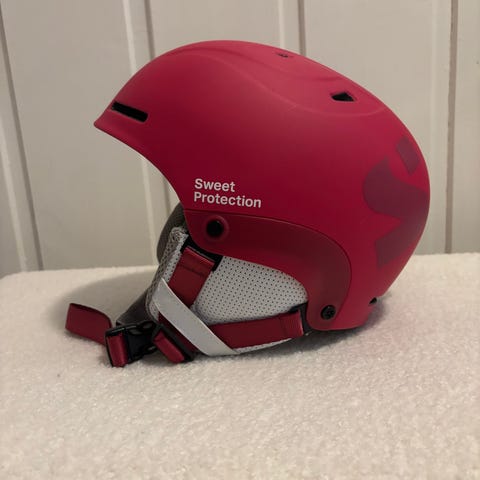 Frost ski- og snowboardhjelm med integrerte briller, i lilla og rosa farger. Hjelmen har justerbar stropp og polstret innside for komfort. Designet for beskyttelse under vintersportaktiviteter.