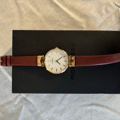 Mockberg dameklokke med svart urskive og svart reim. Klokken har et minimalistisk design. Pent brukt. Klokken har stoppet og trenger å bytte batteri, men funker som den skal når det er gjort! Denne finnes ikke i butikk/på nett lengre!