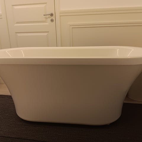 Hjørnebadekar i hvit med avrundet design. Passer til montering i hjørne av bad. Blandebatteri medfølger. Godt egnet for baderom med begrenset plass.