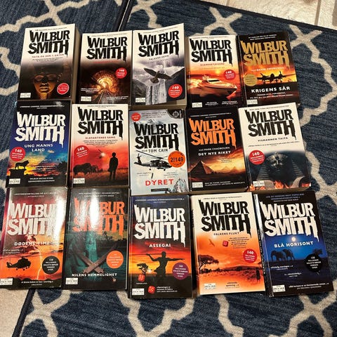 Wilbur Smith Romaner samling med flere titler inkludert Ørkengud, Vismannen Tata, Falkens Flukt, Solfuglen, Farao, og Hapi - Elvegudinnen. Bøkene er i forskjellige utgaver og størrelser, alle på norsk.