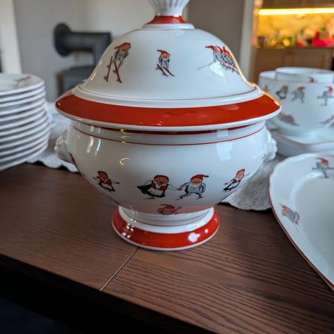 Terrin med lokk fra Porsgrunds Porselænsfabrik og serien Nisse. En flott serveringsbolle med et praktisk lokk som holder maten lengre varm, utmerket til servering av alt fra grøt til supper. Kan også brukes til gløgg.