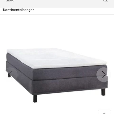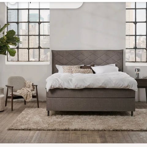 Grå tekstilramme, hvit overmadrass, grå sengeben.