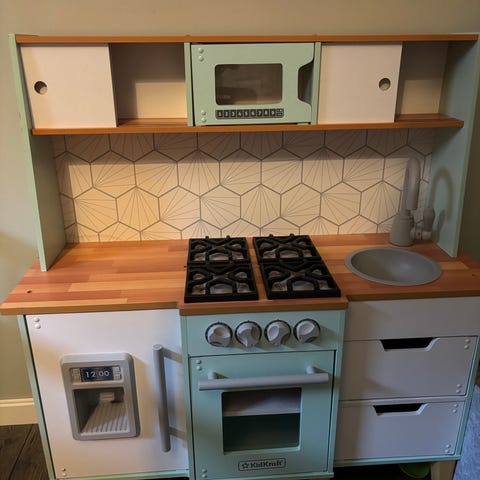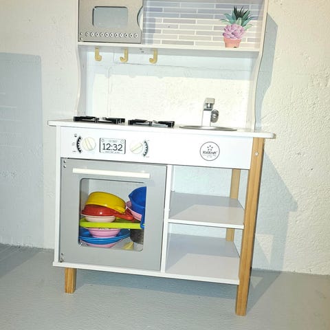 Jollyroom lekekjøkken i tre med hvit og naturlig trefarge. Inkluderer kokeplater, ovn, vask og hyller for oppbevaring. Egnet for barn som ønsker å leke og utvikle rollelekferdigheter.