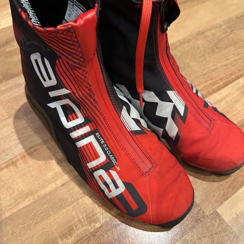 Skoene er fôret med ull. Skoene bærer preg av å være gamle (litt sprukken ved hasen), men er pent brukt. Det er ikke satt i såler, men det er fastlimte såler i skoene.
