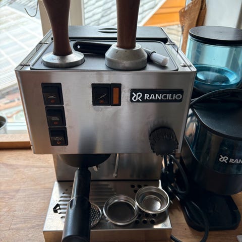 Rancilio espressomaskin i rustfritt stål. Maskinen har flere bryggeknapper og en steamstav for melkeskumming. Maskinen er pent brukt. Under dryppfatet [ikke synlig] har lakken gått av. Jeg har ikke tatt meg tid til å sette ett strøk med bengalakk, men kan gjøre det om ønsket. Passer til bruk i hjem eller små kontormiljøer. Den har fått ny pakkning til bryggegruppen i November. Senda med enda en pakning, 2 original filterholdere, en 1 kopp filter, en 2 kopp filter og en blindfilter. Aldri funksjonsproblemer. Selges grunnet plassmangel.
