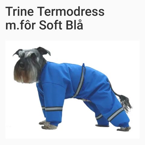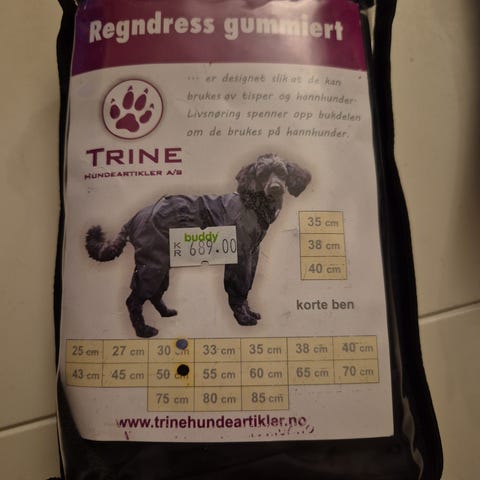 Trine Regndress Gummiert hundregndress i størrelse 70 cm. Regndressen er svart og laget for å beskytte hunder mot regn og fuktighet. Den har korte ben og er designet for å gi god dekning og beskyttelse under våte forhold. Brukt den et par ganger.